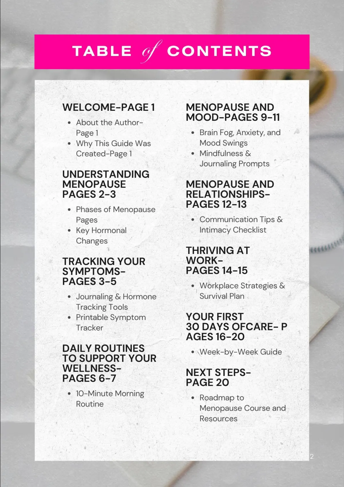 Navigating menopause can feel overwhelming, but you don’t have to do it alone. This Menopause Survival Guide provides everything you need to understand the changes in your body, track your symptoms, and find relief through actionable tips and routines. From managing hot flashes and brain fog to balancing work and relationships, this guide offers practical, supportive advice rooted in real experience. Download your free guide now and take the first step toward a more confident, informed menopause journey.